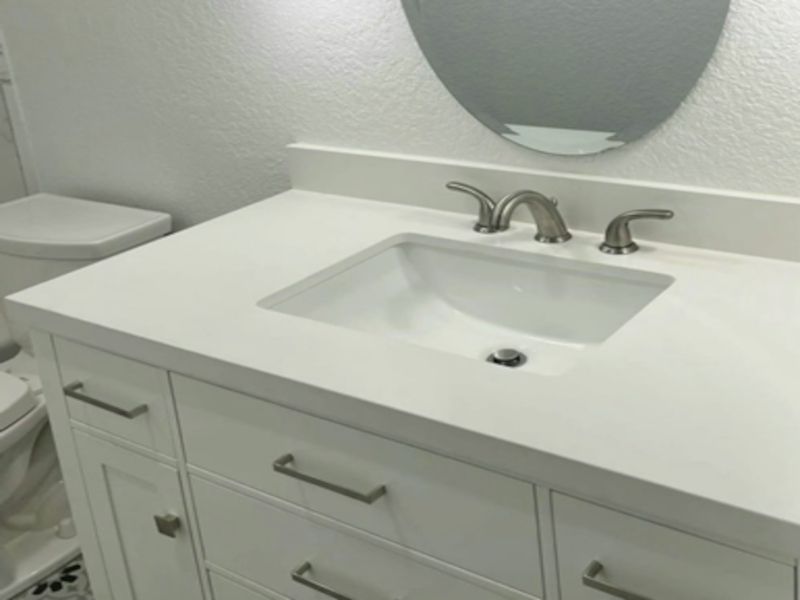 This kitchen features white shaker cabinets with engineered quartz counter top.