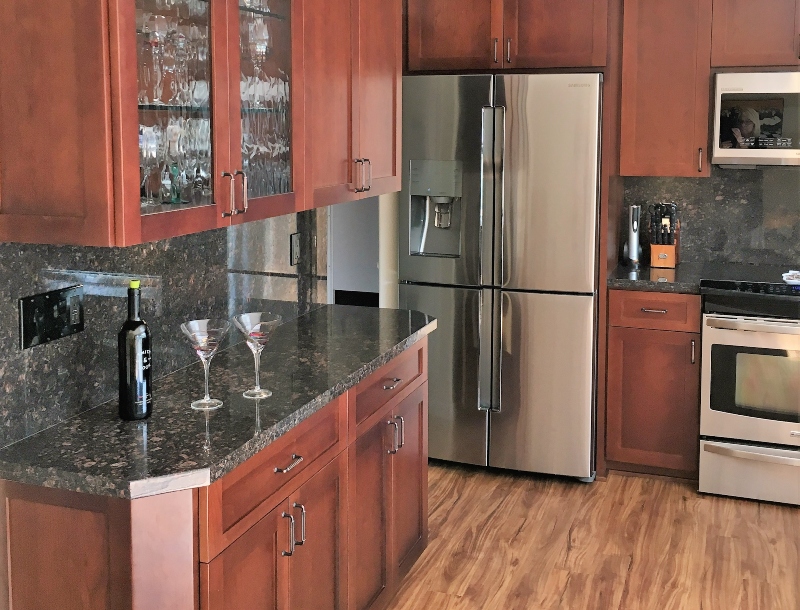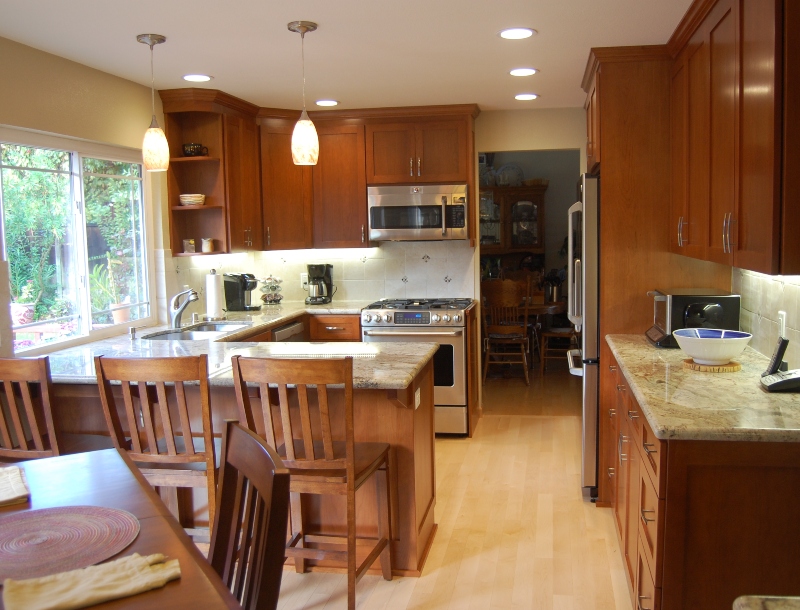 Granite counter tops accentuate rich cherry shaker cabinets in this Almaden kitchen.