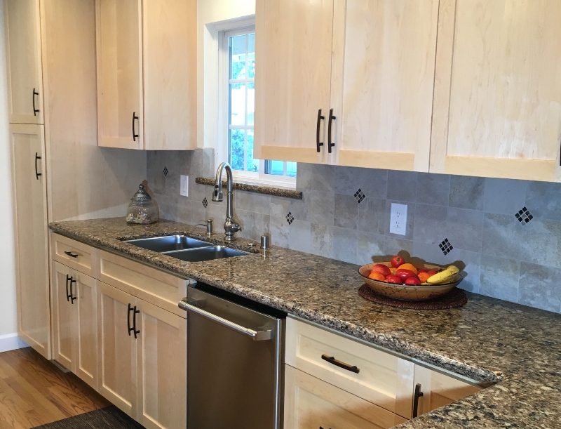 This Santa Clara kitchen features glazed maple cabinets, slab counter, and complementary tile backsplash.