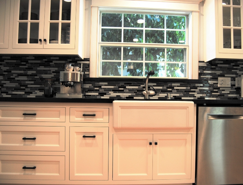This beautiful kitchen in Los Altos Hills features white shaker cabinets, a farm house sink, and dark glass mosaic backsplash.
