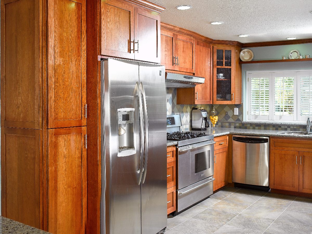 This Craftsman Shaker style kitchen in Willow Glen features rich cherry cabinets and stainless steel appliances