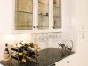 Picture 3: This modern kitchen features a bar with glass upper cabinet doors, a stainless steel wine cooler, and glassware racks. Throughout the kitchen, white cabinets, silver hardware, and granite counter tops create a light and airy feel that is enhanced by wood floors and a three panel window.