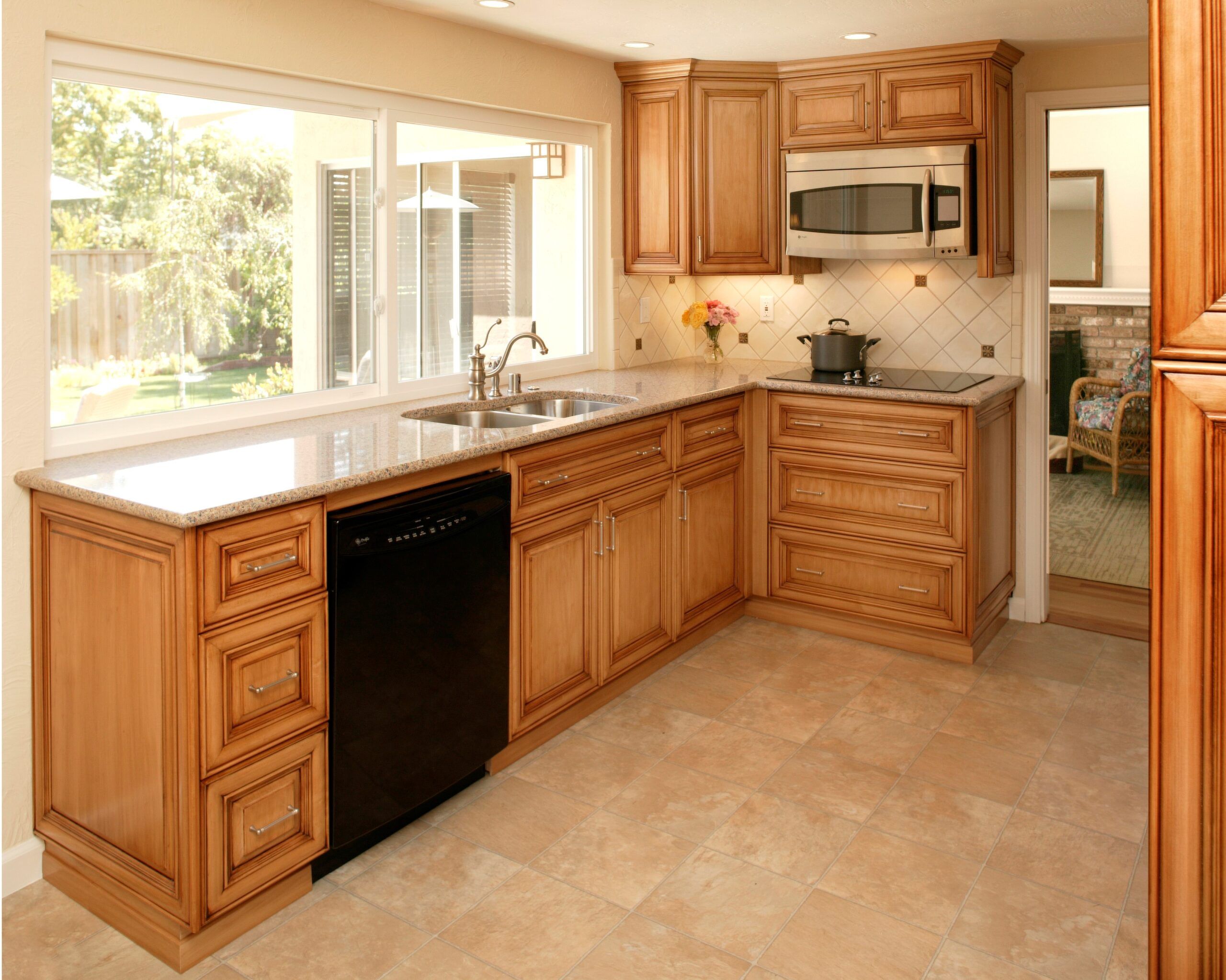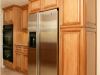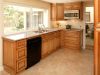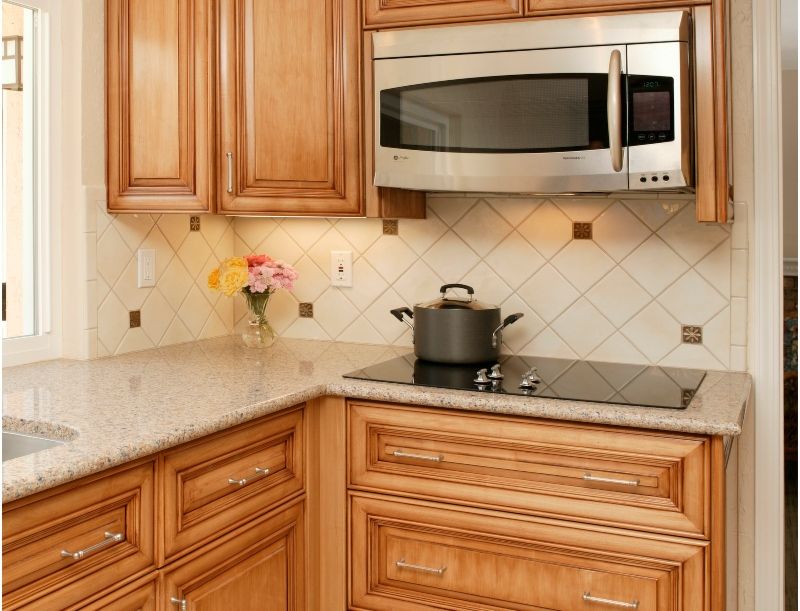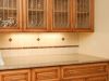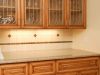 This Santa Clara kitchen features glazed maple cabinets, slab counter, and complementary tile backsplash.   Glazed maple cabinets with raised panel doors and double ovens complete this bright Santa Clara kitchen.