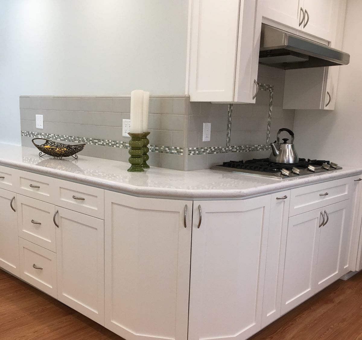 This bright, modern kitchen features white cabinets with silver hardware and quartz counter tops. A grey tile and mosaic backsplash adds dimension and ties this kitchen together.