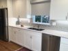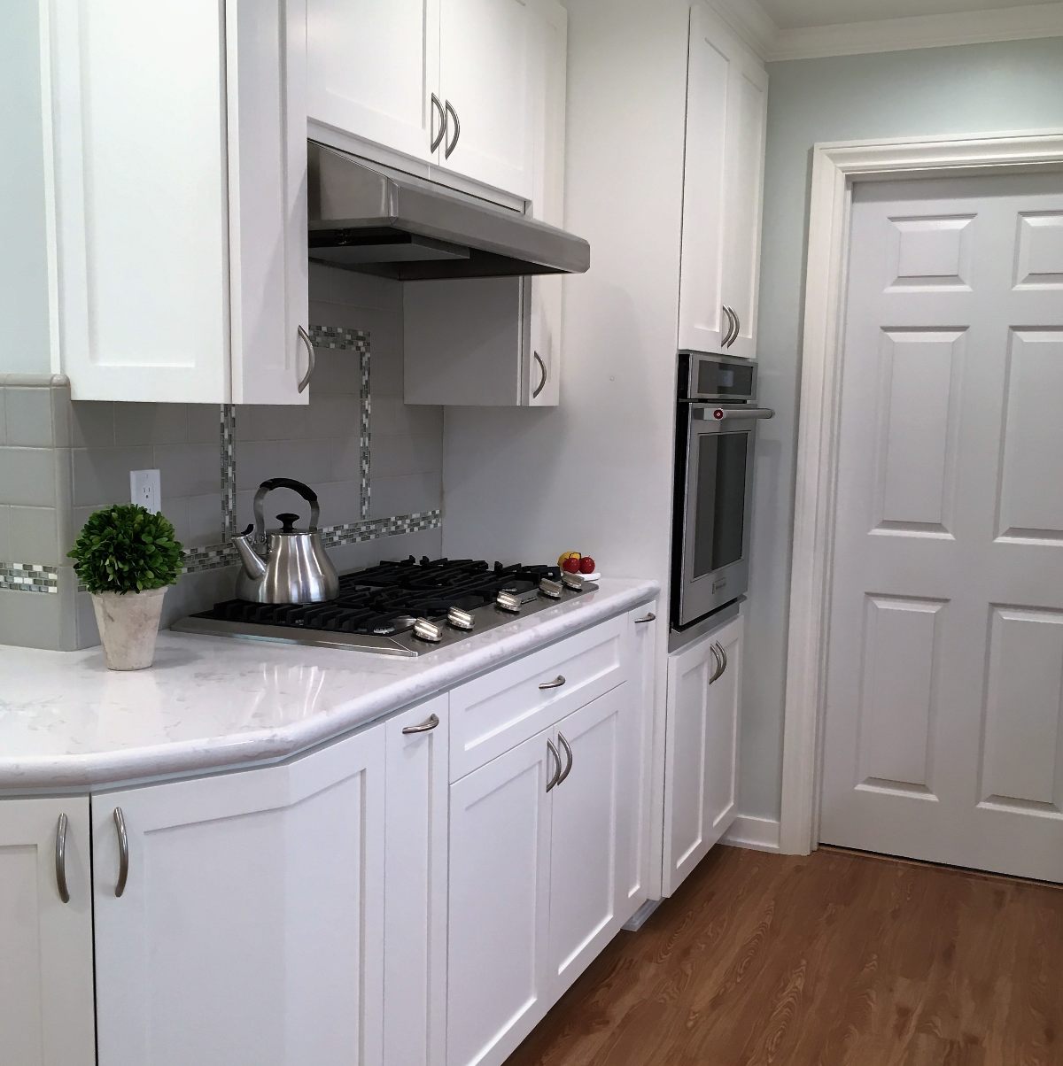 Picture 3: We took advantage of usable space with white wrap around cabinets in this Mountain View home. The white cabinets and quartz counter tops are contrasted with a grey subway tile backsplash and stainless steel appliances to match. Rich wood flooring creates additional warmth in this modern kitchen.