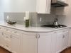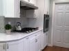Picture 2: These white wraparound cabinets utilize empty wall space and add storage with both upper and lower cabinets. The grey tile backsplash enhances the silver hardware on the cabinets, while quartz counter tops tie together this bright and airy kitchen.