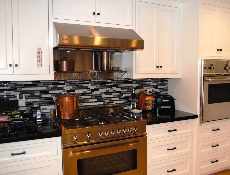 Picture 2: Dark counter tops accentuate this kitchen’s glass mosaic backsplash and contrast with the white shaker cabinets in this Los Altos Hills kitchen.