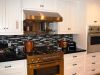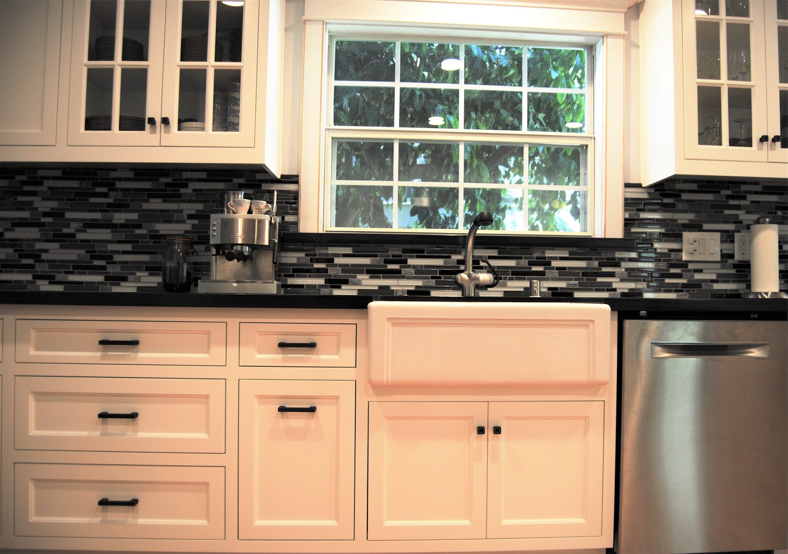 Picture 1: This beautiful kitchen in Los Altos Hills features white shaker cabinets, a farm house sink, and dark glass mosaic backsplash.