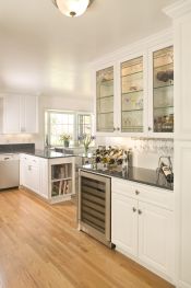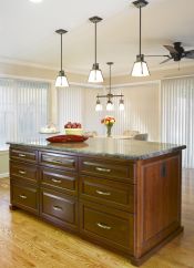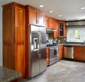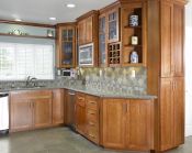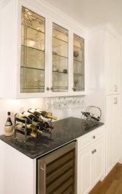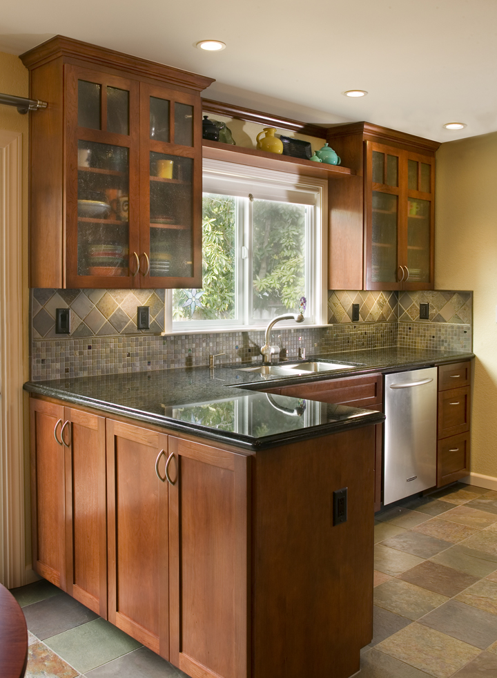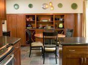 Our client for this project is an interior designer who chose custom cherry shaker style cabinets and a granite counter top with tumbled slate and mosaics splash, a slate floor, and glass doors on selected upper cabinets selected upper cabinets.
